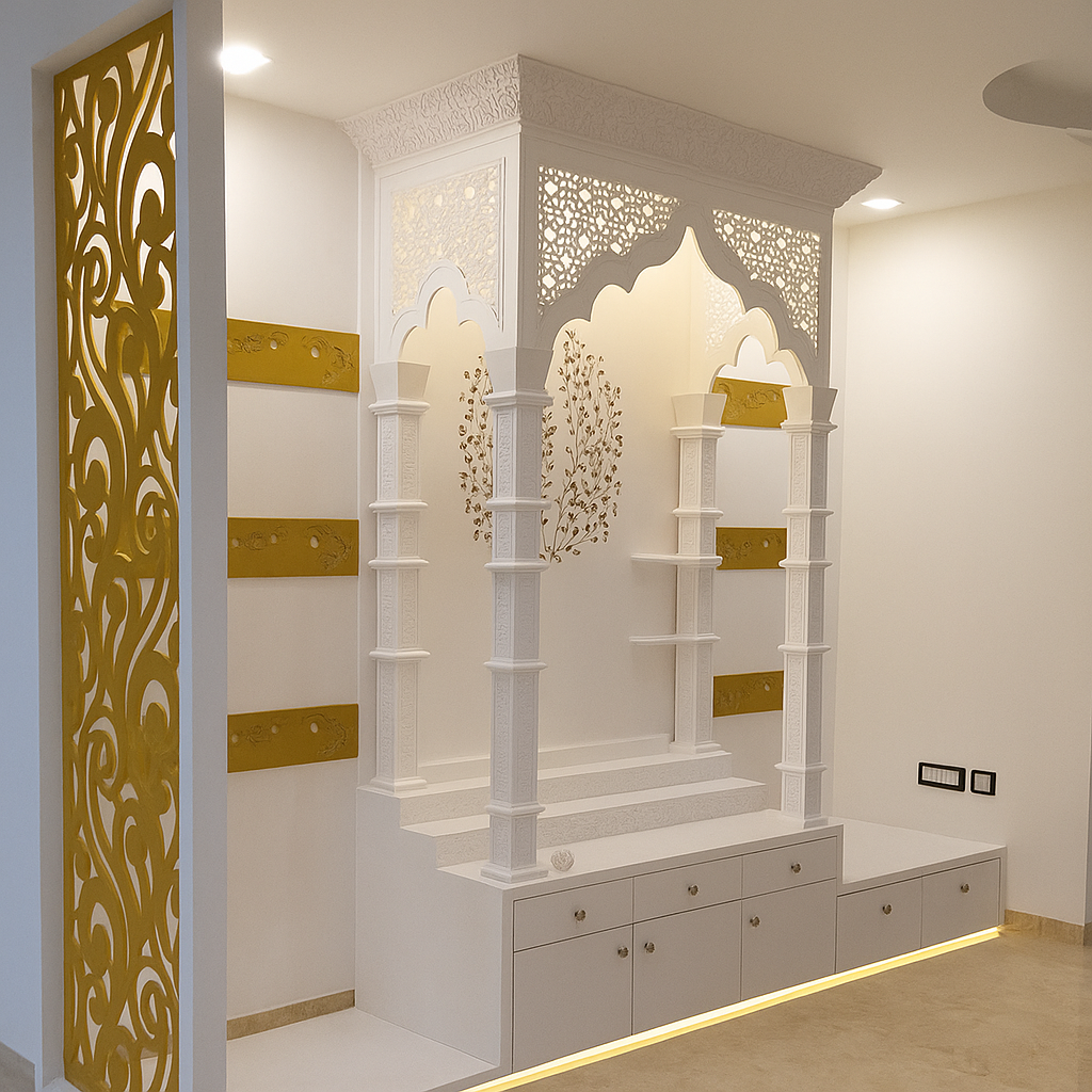 All-White Traditional Temple with Gold Jali Partition