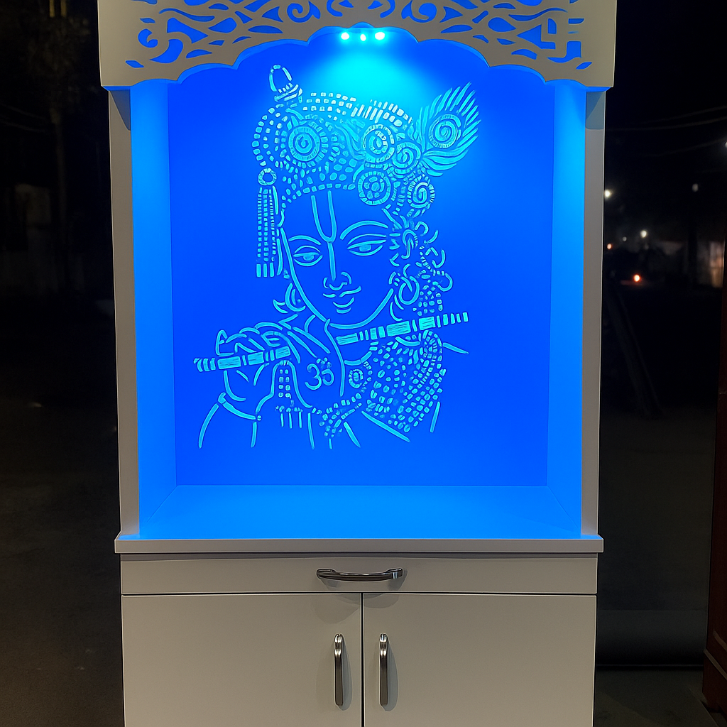 Backlit Mandir with Radha-Krishna Carving